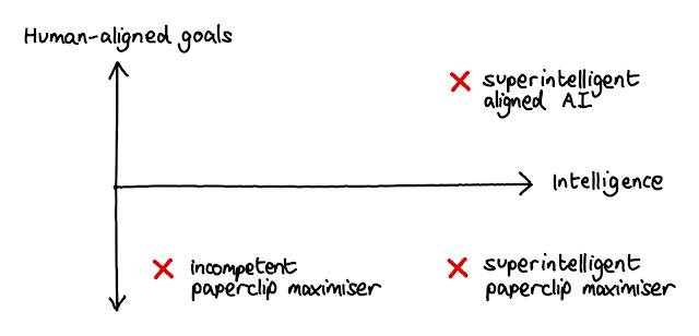 Here, orthogonal means “at right angles” or “unrelated” – in other words we can imagine a graph with one axis representing intelligence, and another representing the agent’s goals, with any point in the graph representing a theoretically possible agent*. The classic example here is a “paperclip maximiser” - a powerful AGI driven only by the goal of making paperclips.