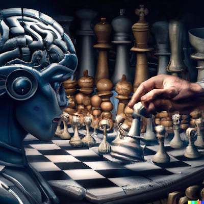 Above: an image generated by OpenAI’s DALL-E 2, from the prompt: "artist's impression of an artificial intelligence thinking about chess, digital art, artstation".