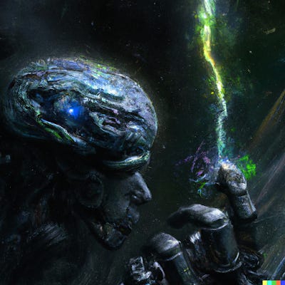 Above: yet another image from OpenAI's DALL-E 2. Perhaps it was trying for a self portrait? (Prompt: "Artists impression of artificial general intelligence taking over the world, expressive, digital art")