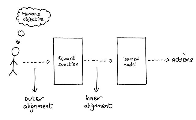 There are two broad families of ways techniques like this can fail. The first is when our reward function fails to fully express the true preferences of the programmer - we refer to this as outer misalignment. The second is when the AI learns a different set of goals than those specified by the reward function, but which happens to coincide with the reward function during training - this is inner misalignment. We will now discuss each of these in turn.