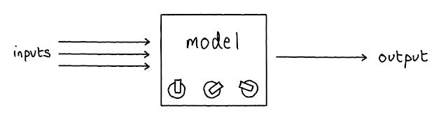 Step 1: you define a statistical model. This takes the form of some equation that has some unknown constants (“parameters”) in it, and some variables where you plug in input values. Together, the parameters and input variables define an output. (The equations in ML can be extremely large, for example with billions of parameters and millions of inputs, but they are very structured and almost stupidly simple.)