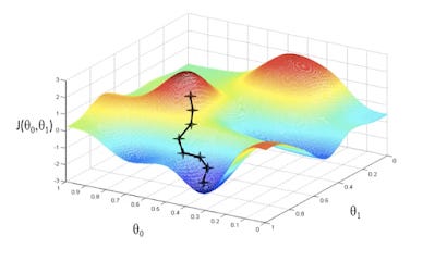 Above: 0 and 1 are parameters, and the vertical axis is the loss (higher is worse). The black line is the path the model takes in parameter space during training.
