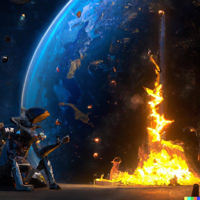 Above: DALL-E really seems to have a natural talent at depicting "The earth is on fire, artificial intelligence has taken over, robots rule the world and suppress humans, digital art, artstation".