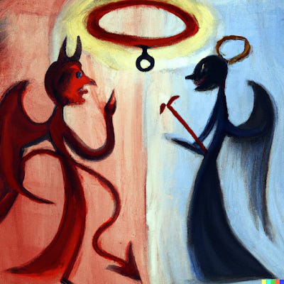 Above: AI agents with inner misalignment were at one point called “optimisation daemons”. DALL-E did not quite successfully depict the description "Two arguments between an angel and a devil, one inside a circle and one on the outside, painting".