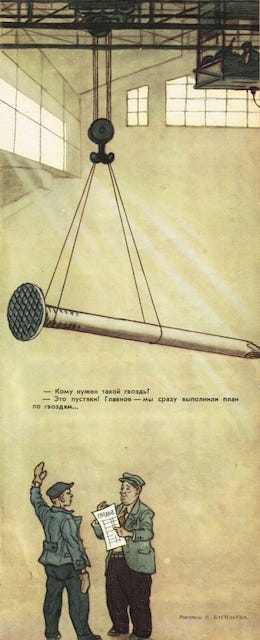 Perhaps the most famous case comes from Soviet nail factories, which produced nails based on targets that they had been given by the central government. When a factory was given targets based on the total number of nails produced, they ended up producing a massive number of tiny nails which couldn’t function properly. On the other hand, when the targets were based on the total weight produced, the nails would end up huge and bulky, and equally impractical.