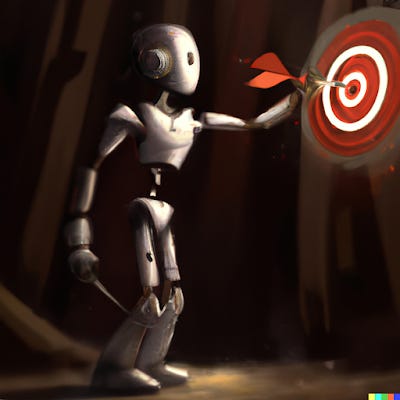 Above: DALL-E image from the prompt "Artist's depiction of a robot throwing a dart at a target, digital art, getting a bullseye, trending on artstation"