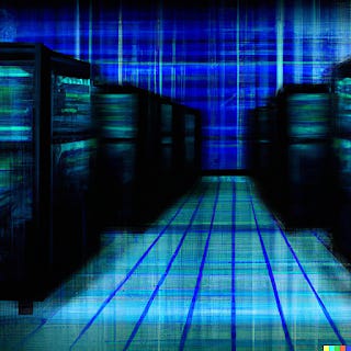 Above: this image also generated by OpenAI’s DALL-E 2, using the prompt "a data center with stacks of computers gaining the spark of intelligence".