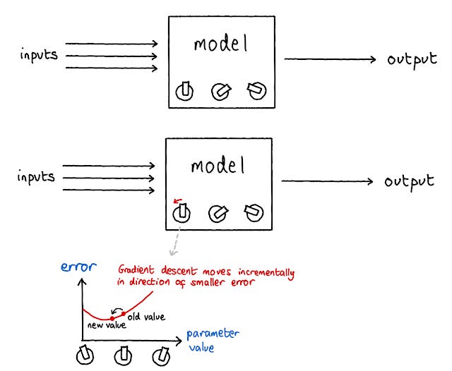 Step 4: There's a simple algorithm called gradient descent, which, when using another algorithm called backpropagation to calculate the gradient, can tell you which direction all the parameters should be shifted to make the ML system slightly better (as judged, for example, by its performance on examples in a dataset).