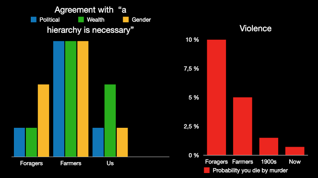 With industrialisation, we've managed to roll back the discrimination and hierarchy of the farming age. We've even gone back to valuing fairly flat political hierarchies like the foragers (though we maintain them through democratic institutions rather than "coalitions of losers"), and become more egalitarian about gender than the foragers were, all the while living in societies far less violent than the average hunter-gatherer band.