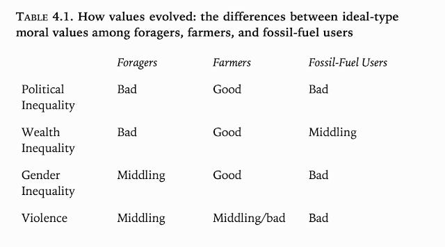 “Instead of thinking that values are determined by modes of energy capture, perhaps we should think that as human beings began to be in a position to amass power and property in the agricultural age, forms of ideology set in that distorted real moral values [i.e. the values a society should hold], distortions that we are only now, in the age of science and extensive literacy, beginning to overcome.”