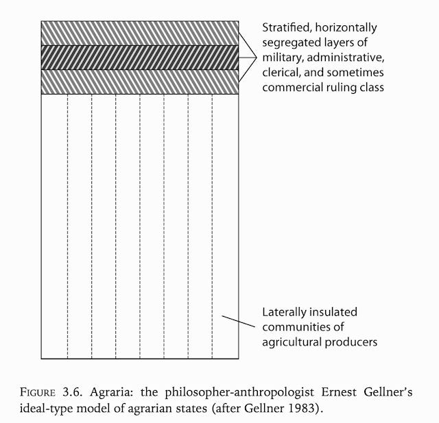 As with foragers, Morris lumps together farming societies into one ideal type, labelled Agraria by Ernest Gellner. As before, this covers up a lot of variation (in particular, he identifies horticulturalists, city states like classical Athens or medieval Venice, and proto-industrial nations like Qing dynasty China, Mughal India, Ottoman Turkey, and Enlightenment Western Europe as the three extremes of Agraria), but Morris argues "the exceptions and sub-categories should not be allowed to obscure the reality of an ideal type representing in abstract terms the core features of peasant farming society". He cites Robert Redfield: