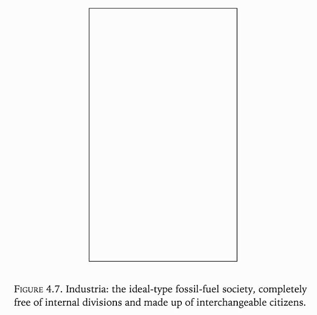 “Agraria had worked by drawing lines, not just between elite and mass or men and women, but also between believers and nonbelievers, pure and defiled, free and slave, and countless other categories. Each group was assigned its place in a complex hierarchy of mutual obligations and privileges, tied together by the Old Deal and guaranteed by the gods and the threat of violence. Fossil-fuel societies, however, work best by erasing lines. The more a group replaces the rigid structure of figure 3.6 with the anti-structure of figure 4.7—a completely empty box, made up of interchangeable citizens—the bigger and more efficient its markets will be and the better it will function in the fossil-fuel world.”